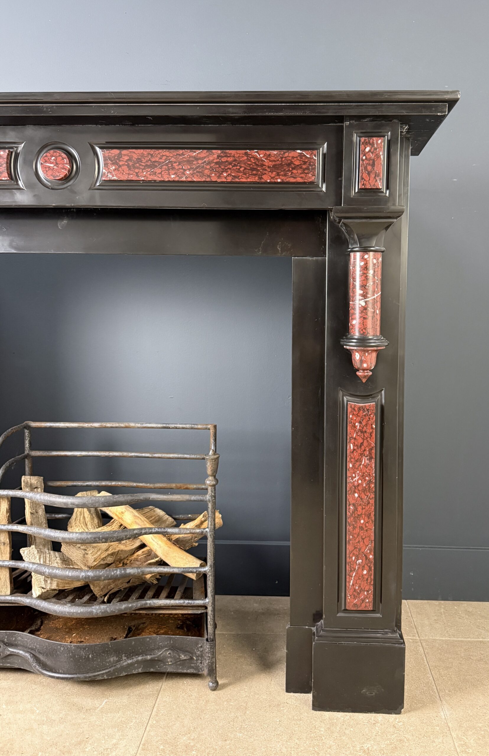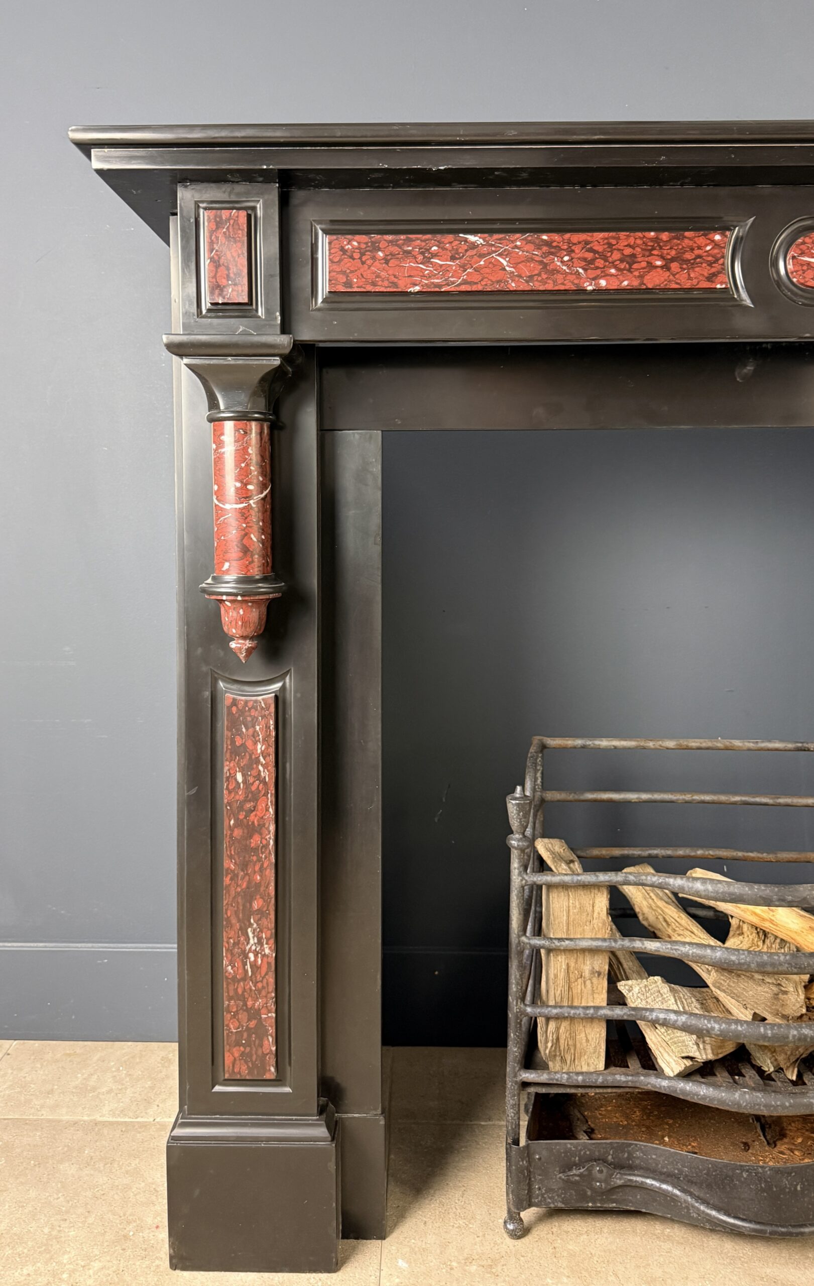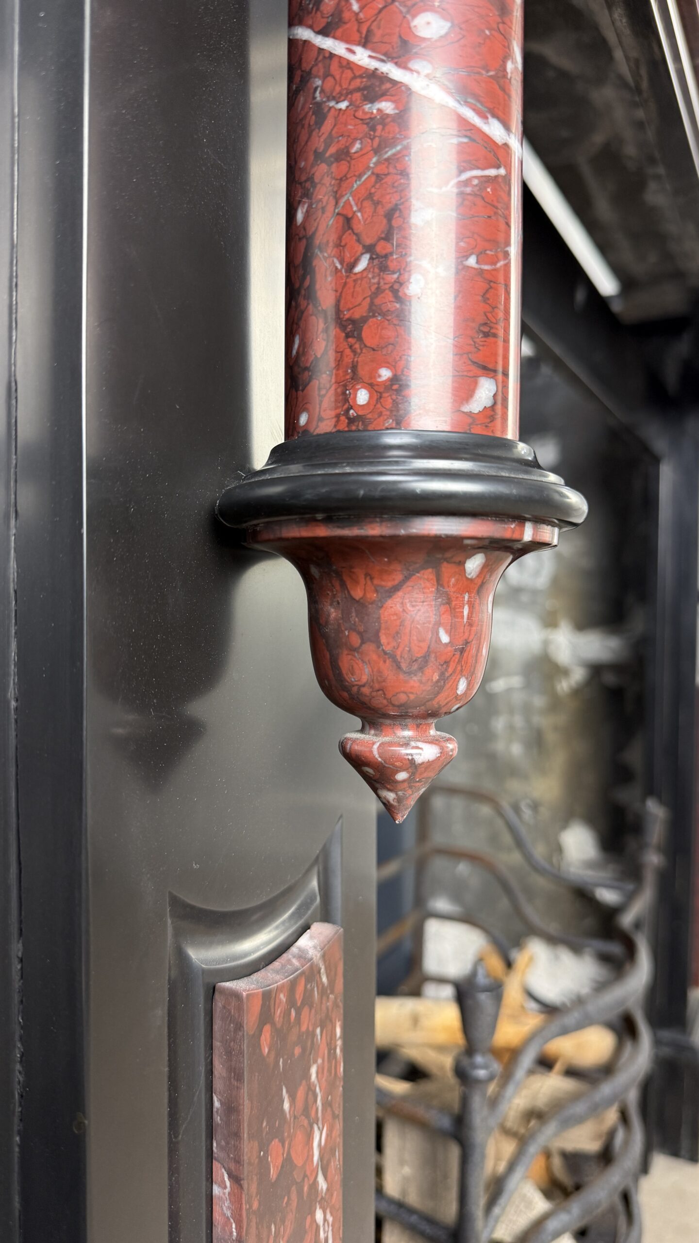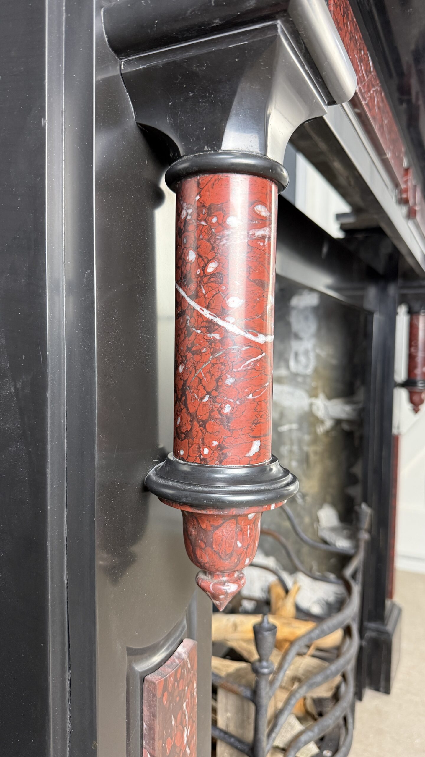 Deze antieke zuilen schouw is uitgevoerd in zwart marmer met ingelegde panelen en zuilen van rood gevlamd marmer met witte aders, Rouge Griotte. De combinatie van het diepe zwart en het warme, levendige rood geeft de schouw een evenwichtige en karaktervolle uitstraling.
