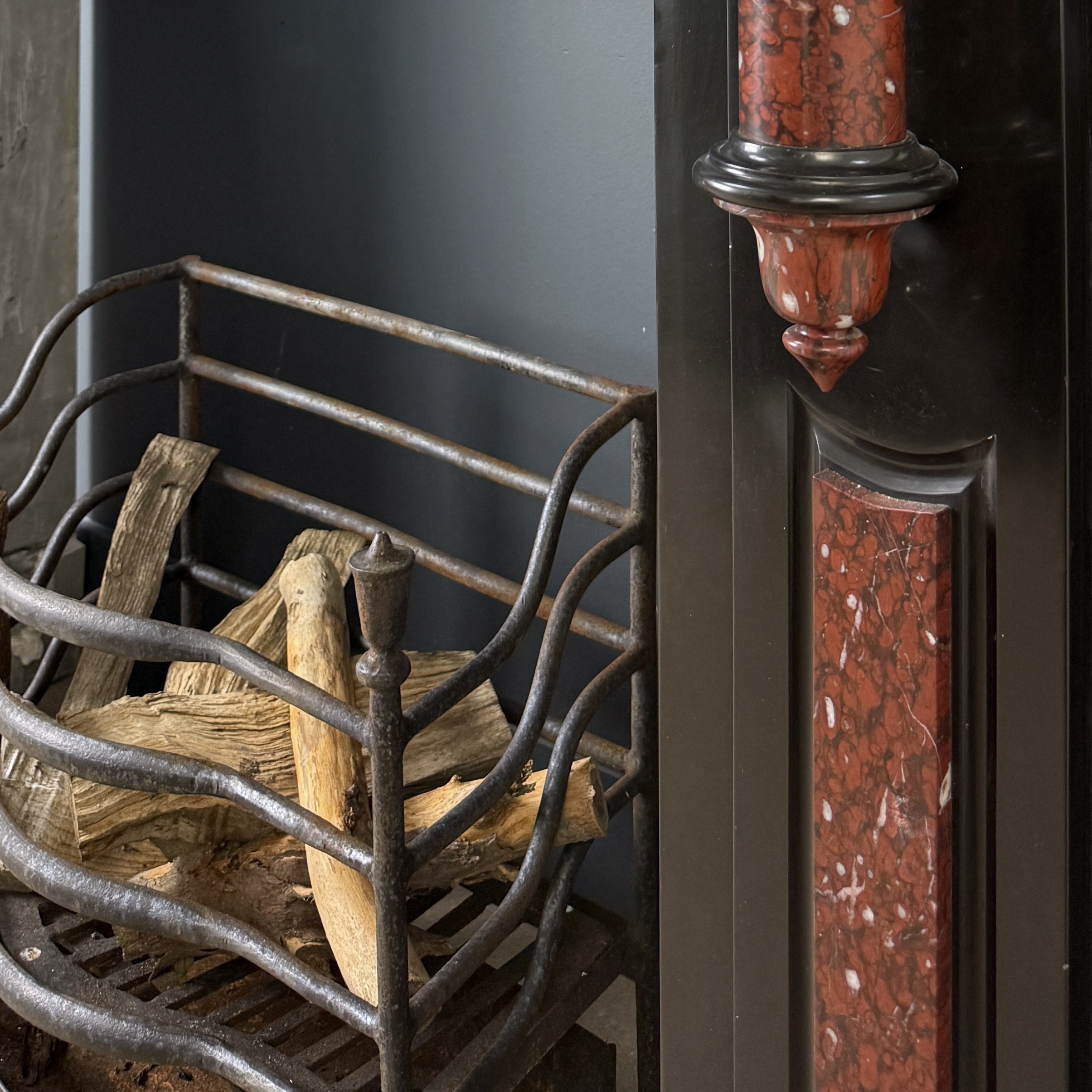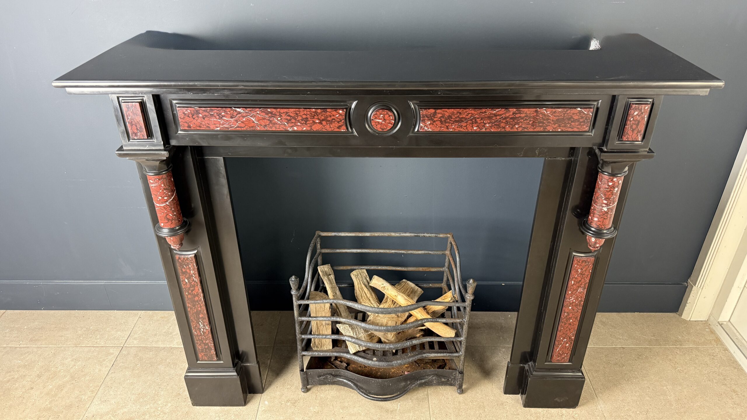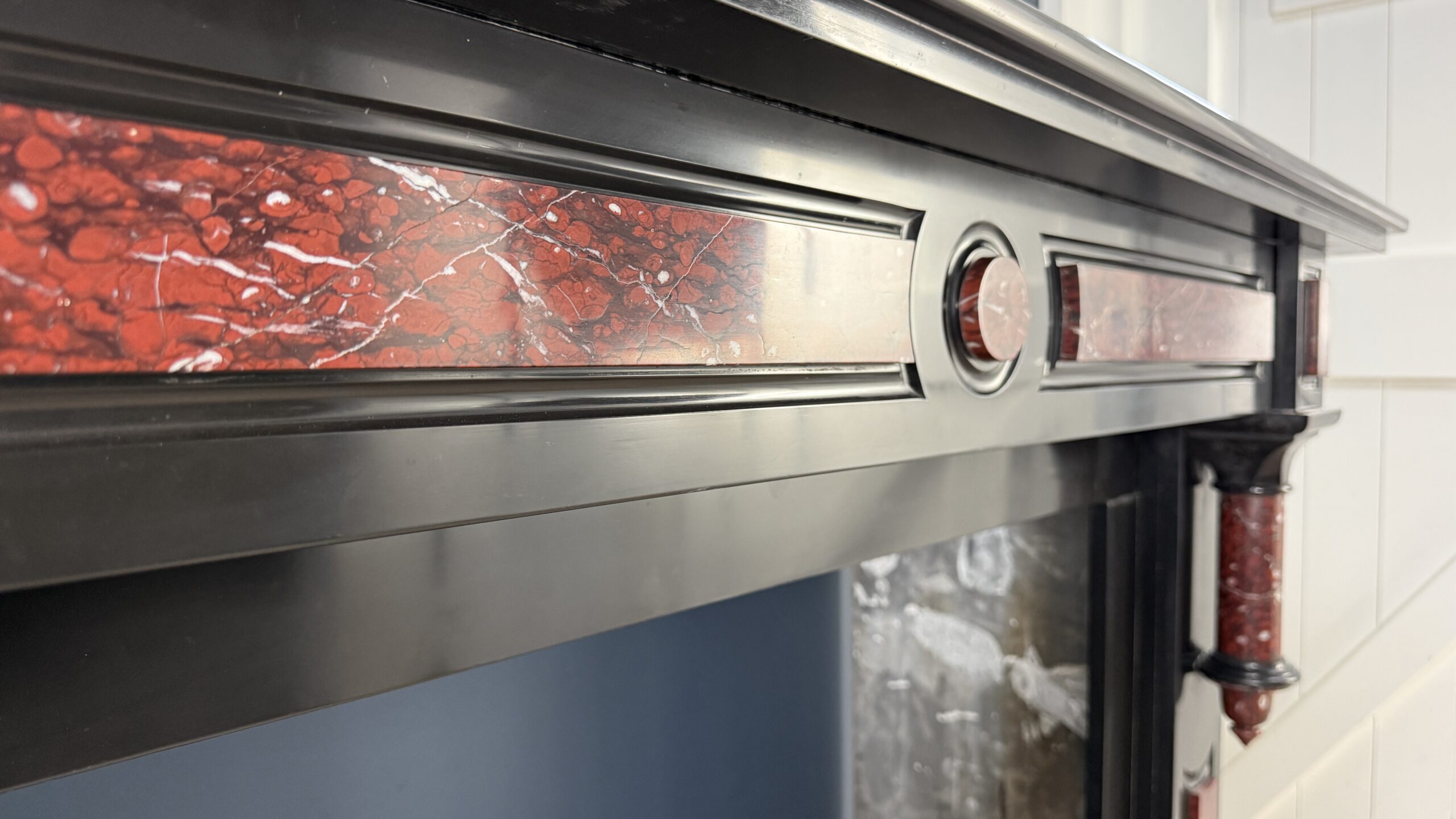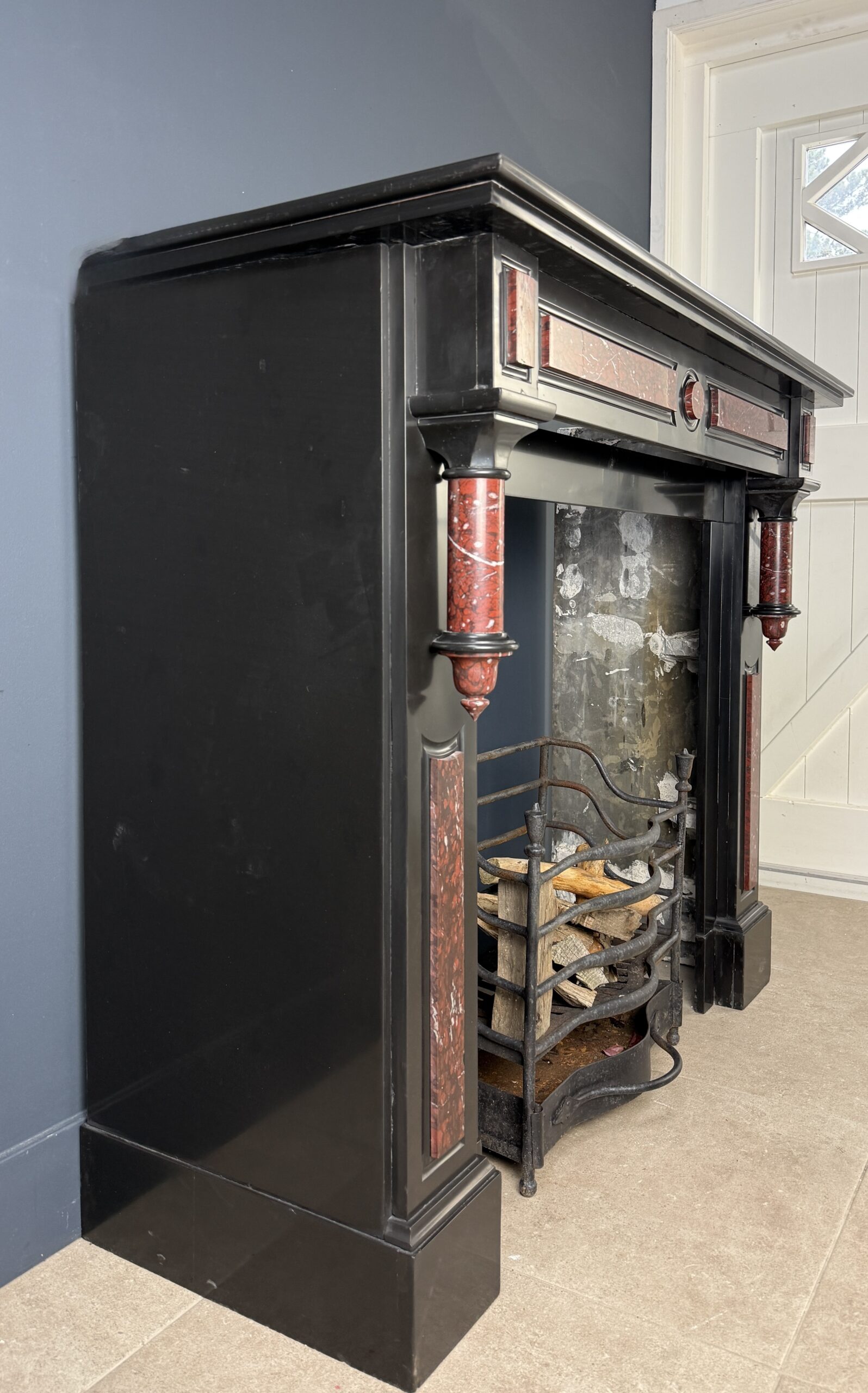 Deze antieke zuilen schouw is uitgevoerd in zwart marmer met ingelegde panelen en zuilen van rood gevlamd marmer met witte aders, Rouge Griotte. De combinatie van het diepe zwart en het warme, levendige rood geeft de schouw een evenwichtige en karaktervolle uitstraling.