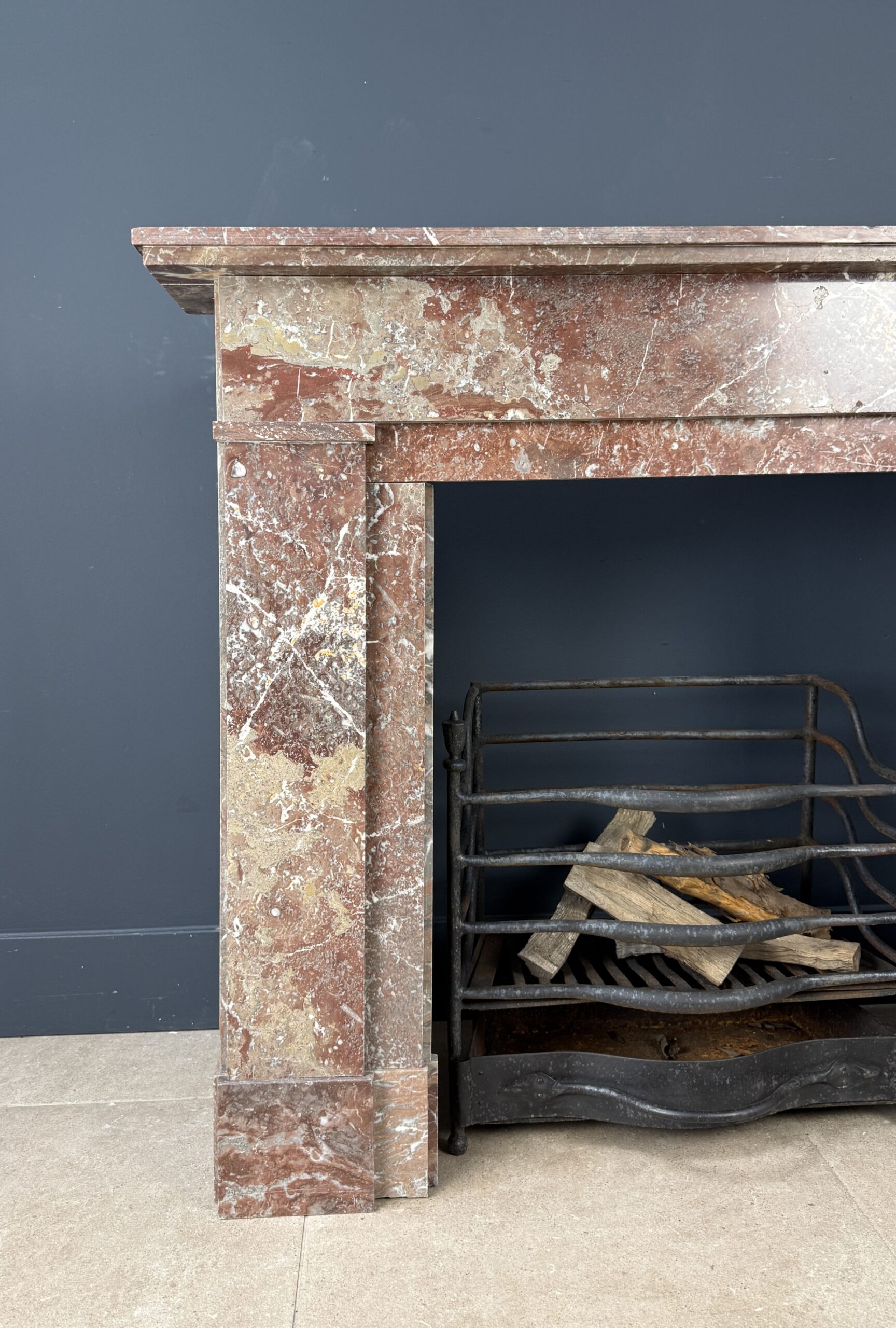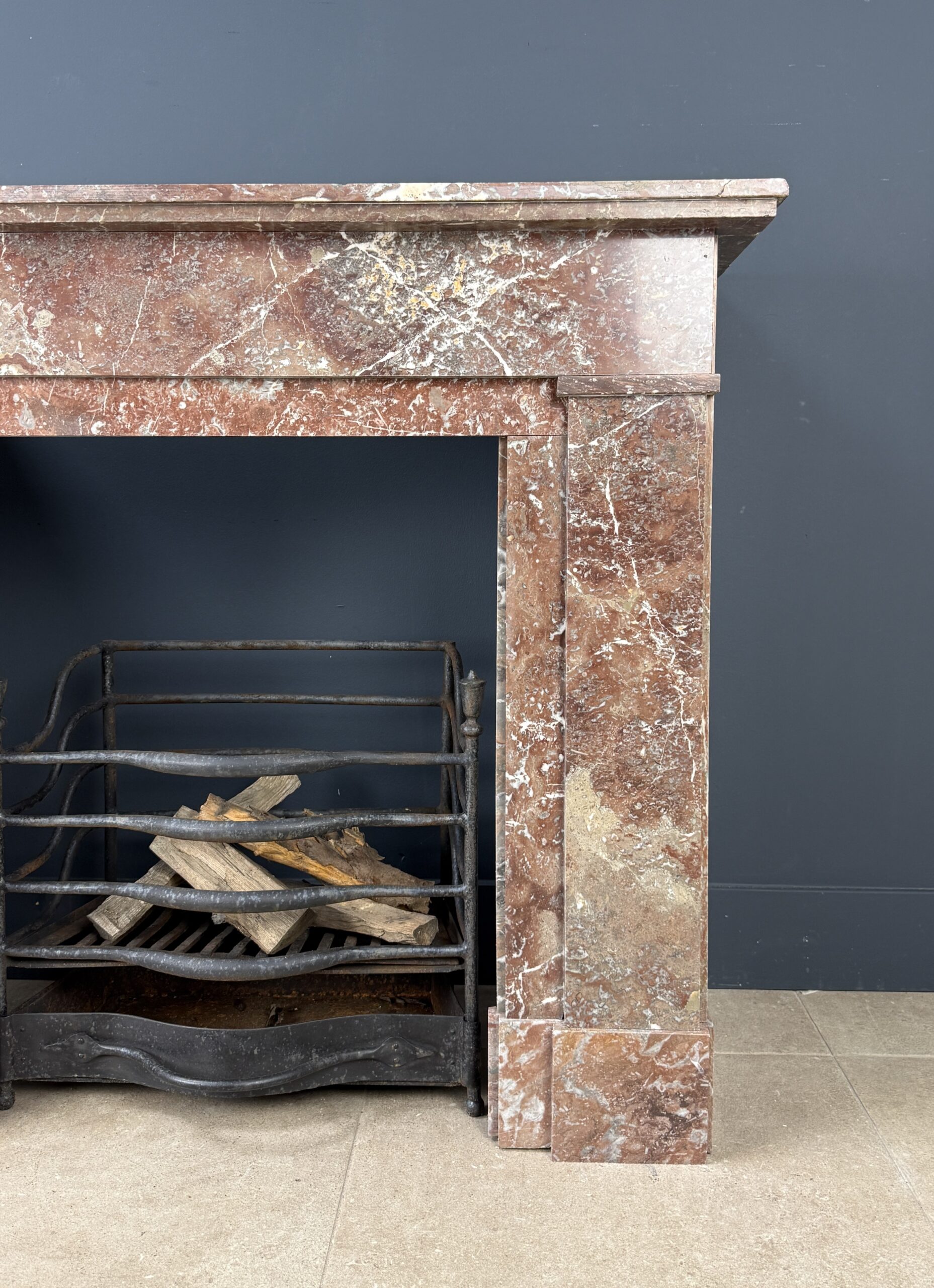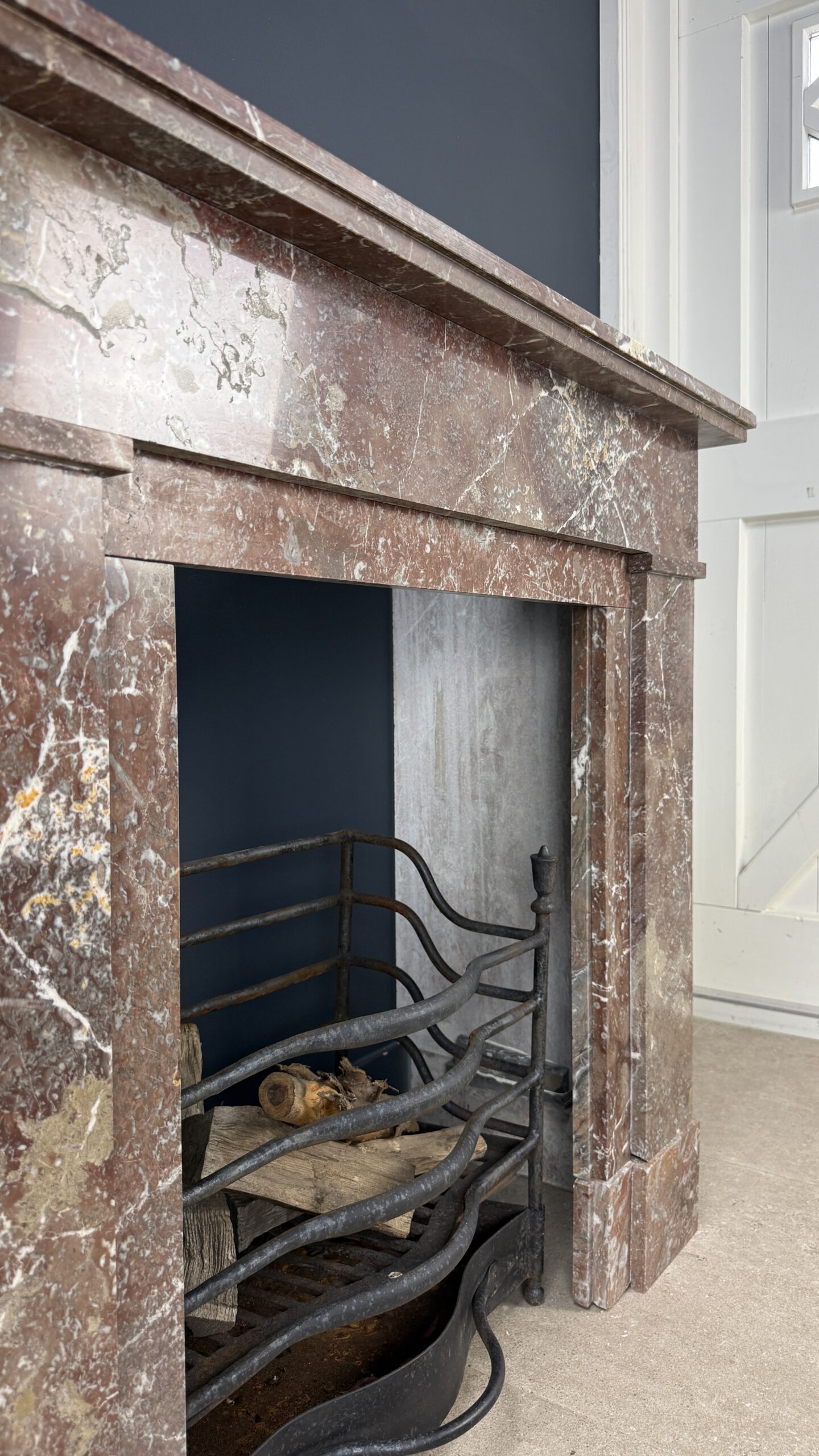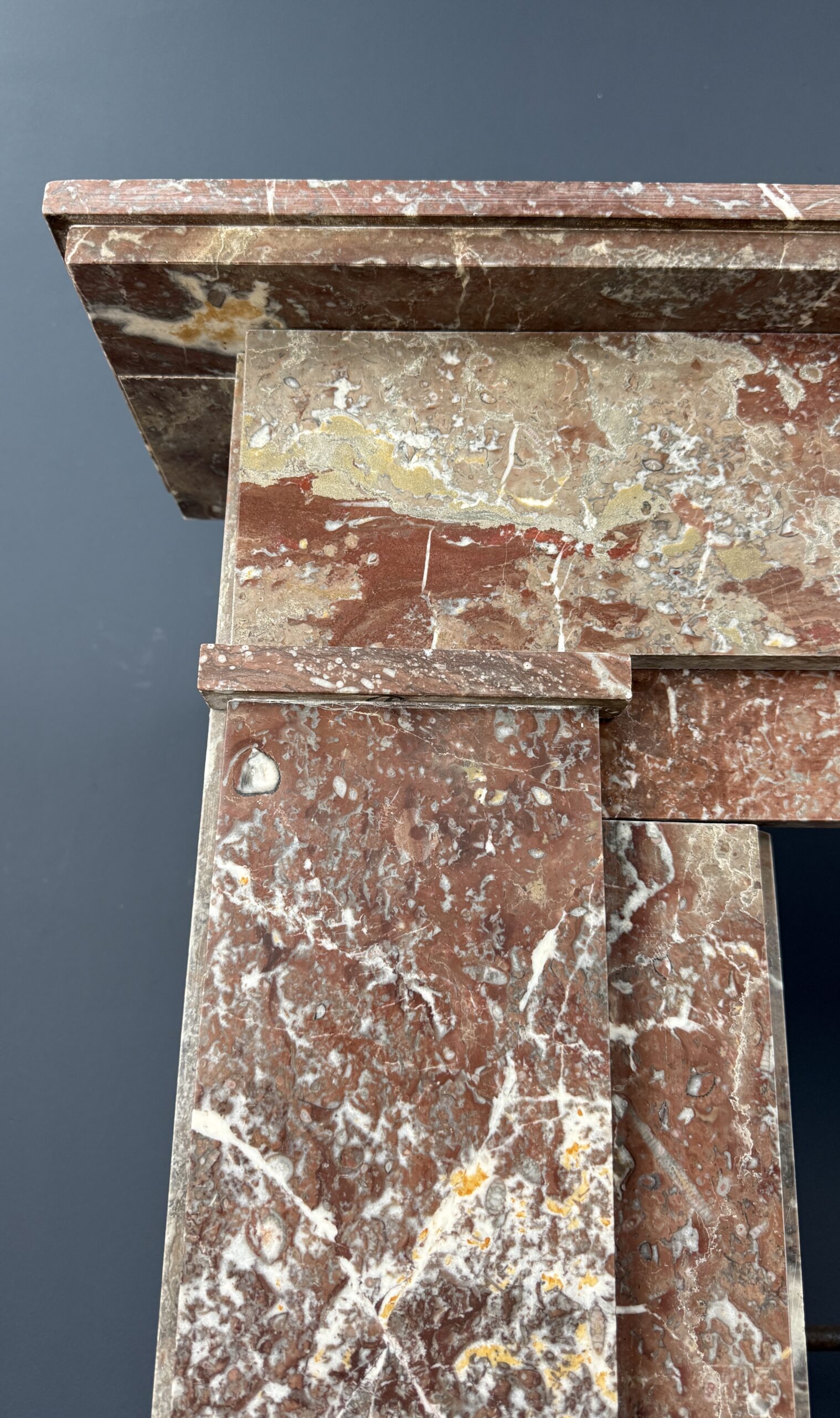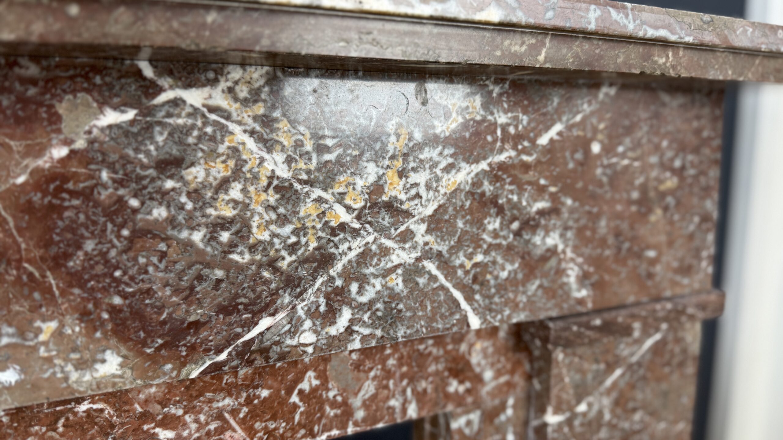 Een stijlvolle antieke omloopschouw een warm roodbruin gesteente met levendige witte, grijze en groen aders die het oppervlak een natuurlijke diepte en elegantie geven. Het rijke kleurenspel en de subtiele glans van het gepolijste marmer zorgen voor een luxueuze uitstraling die kenmerkend is voor de Art Deco-periode.