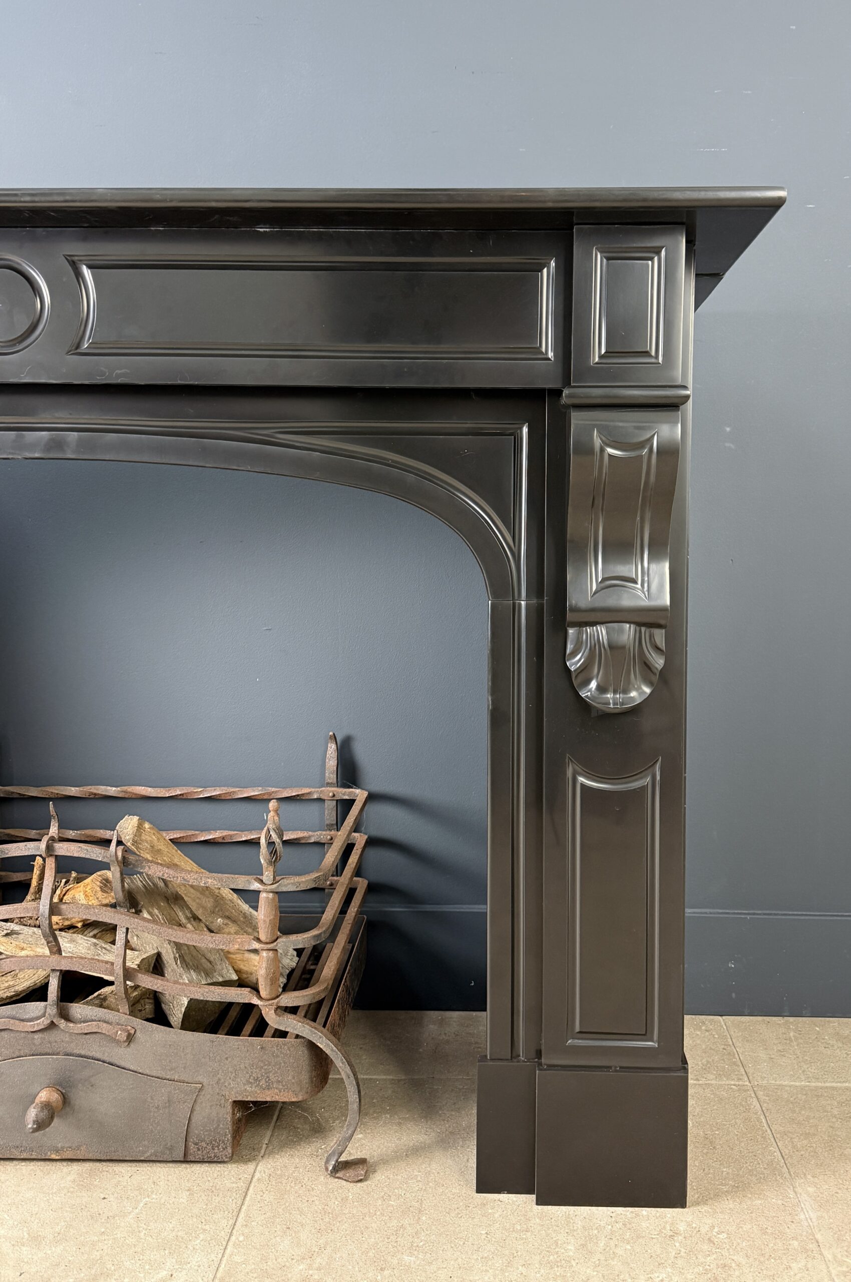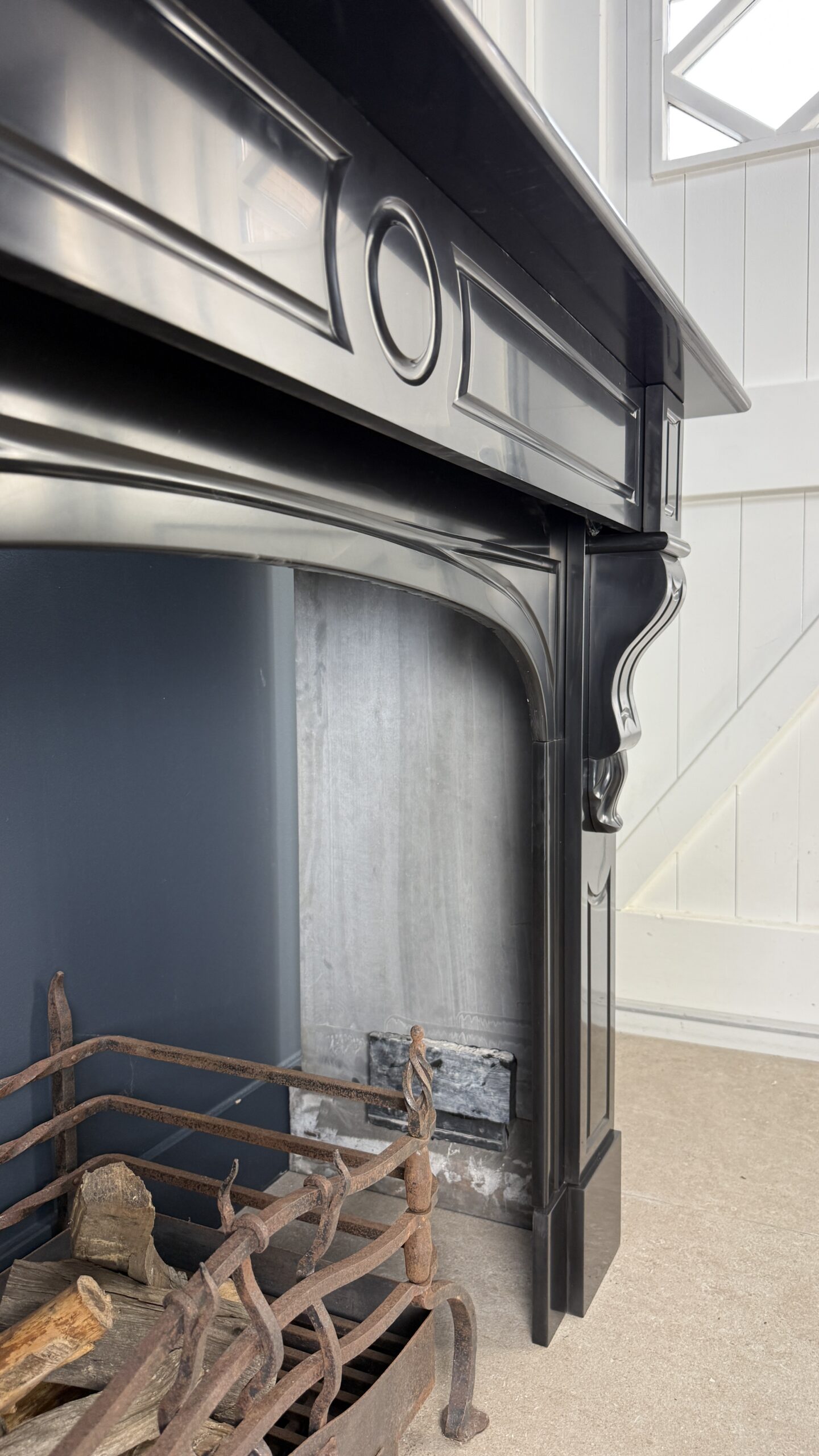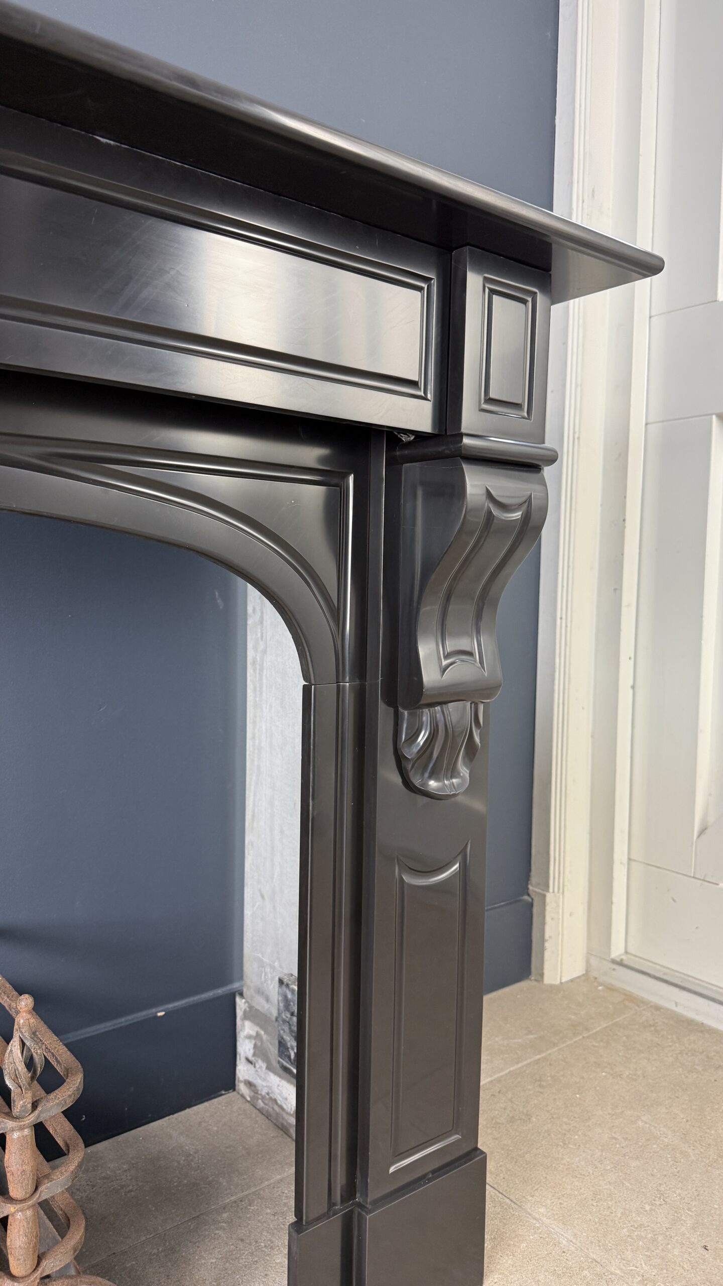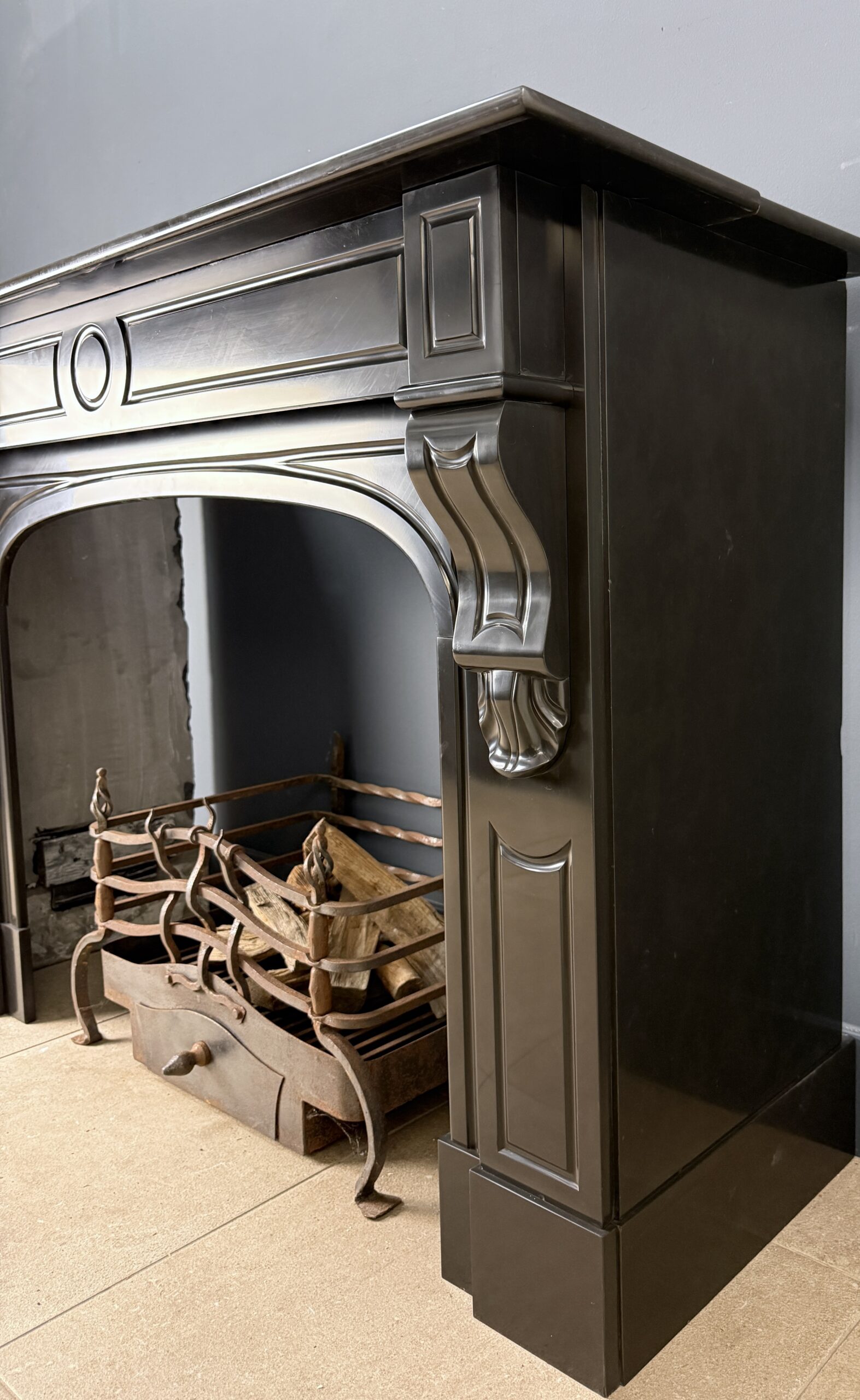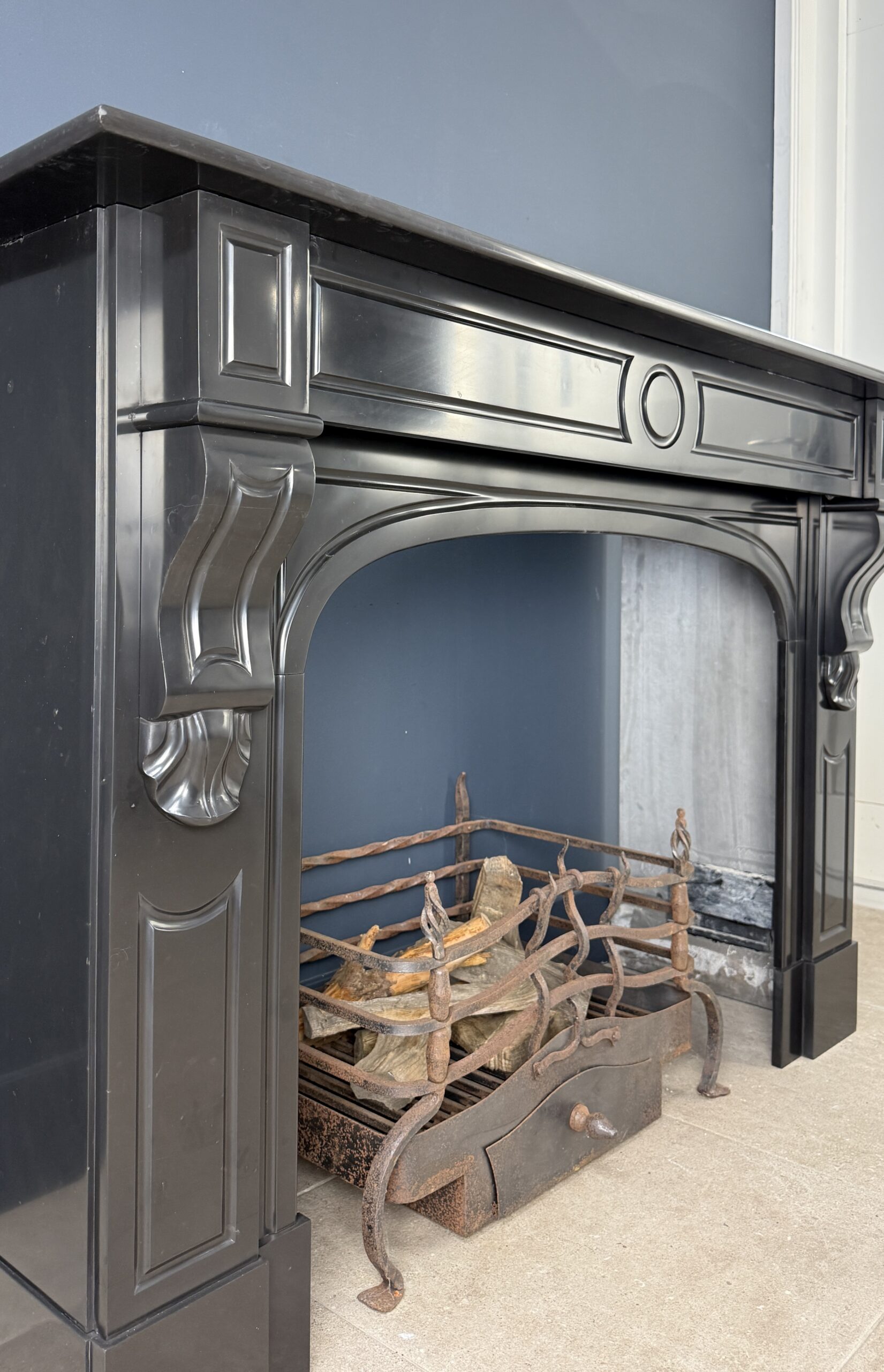 Antieke omloop schouw vervaardigd uit Noir de Mazy , een diepzwart Belgisch marmer dat bekendstaat om zijn egale kleur en zachte glans. Het ontwerp wordt gekenmerkt door een ronde toog, die de opening sierlijk omlijst en het geheel een vloeiende vorm geeft. In het front bevindt zich een rond medaillon, een subtiel klassiek detail dat het strakke lijnenspel doorbreekt.