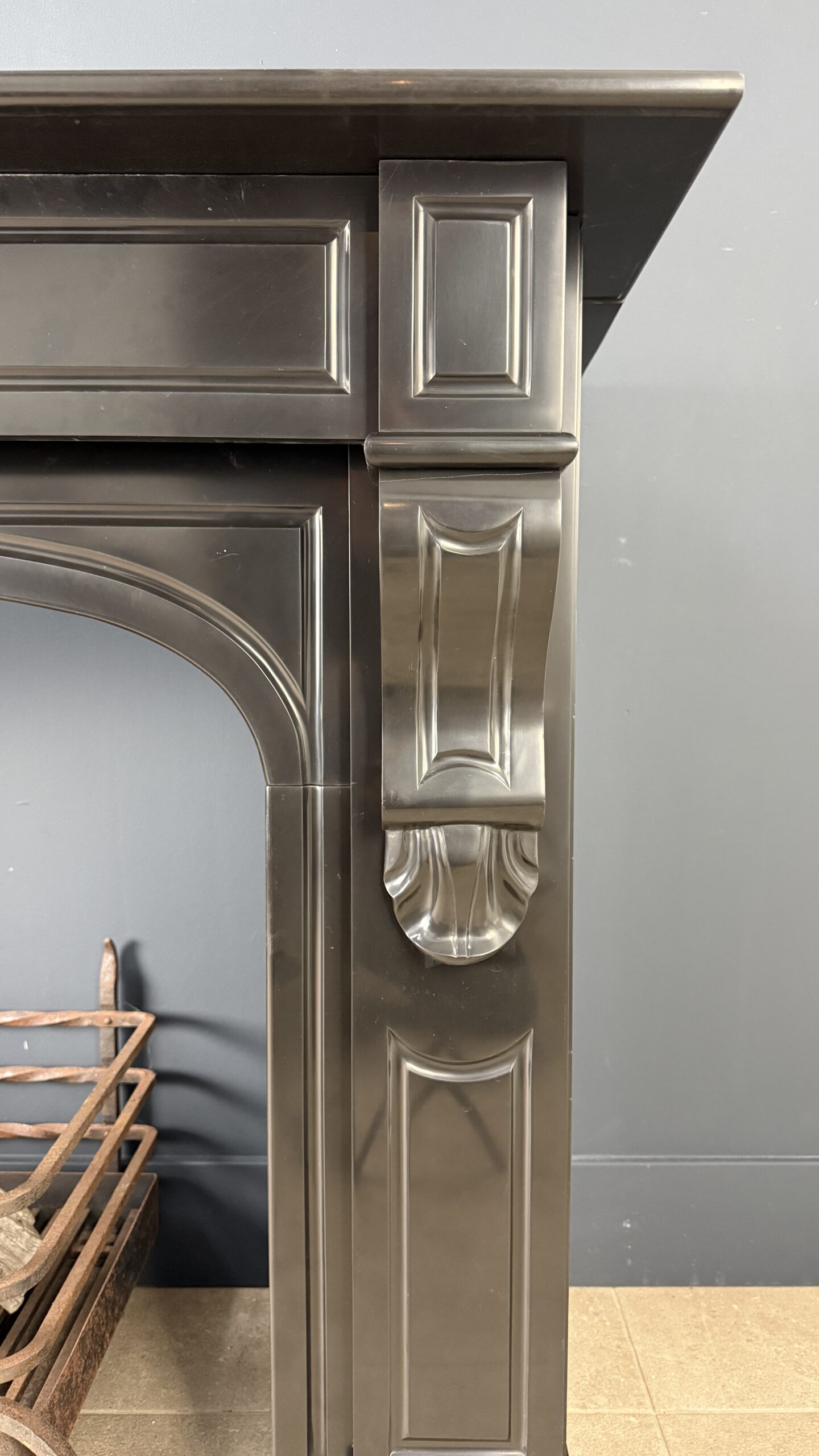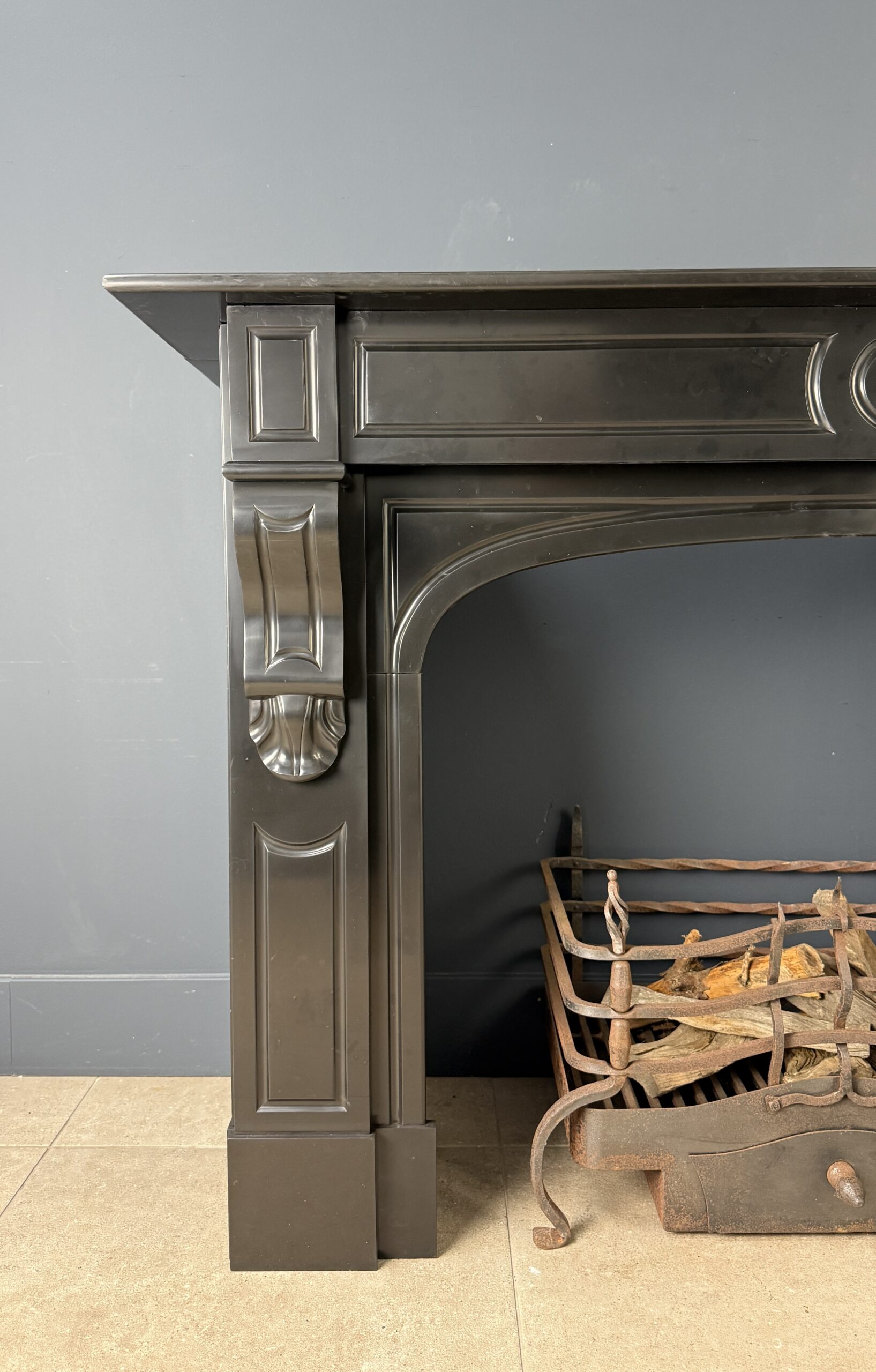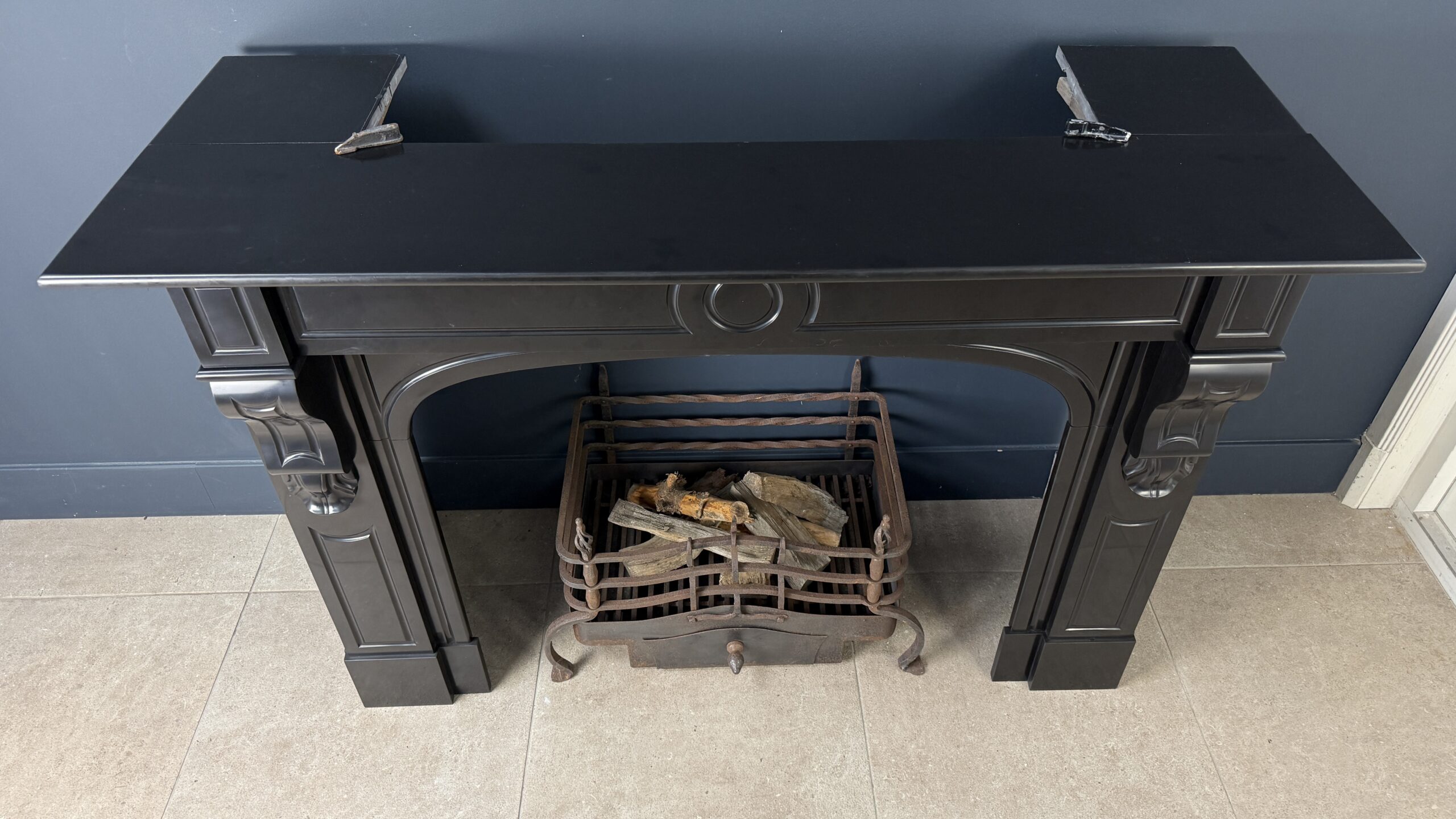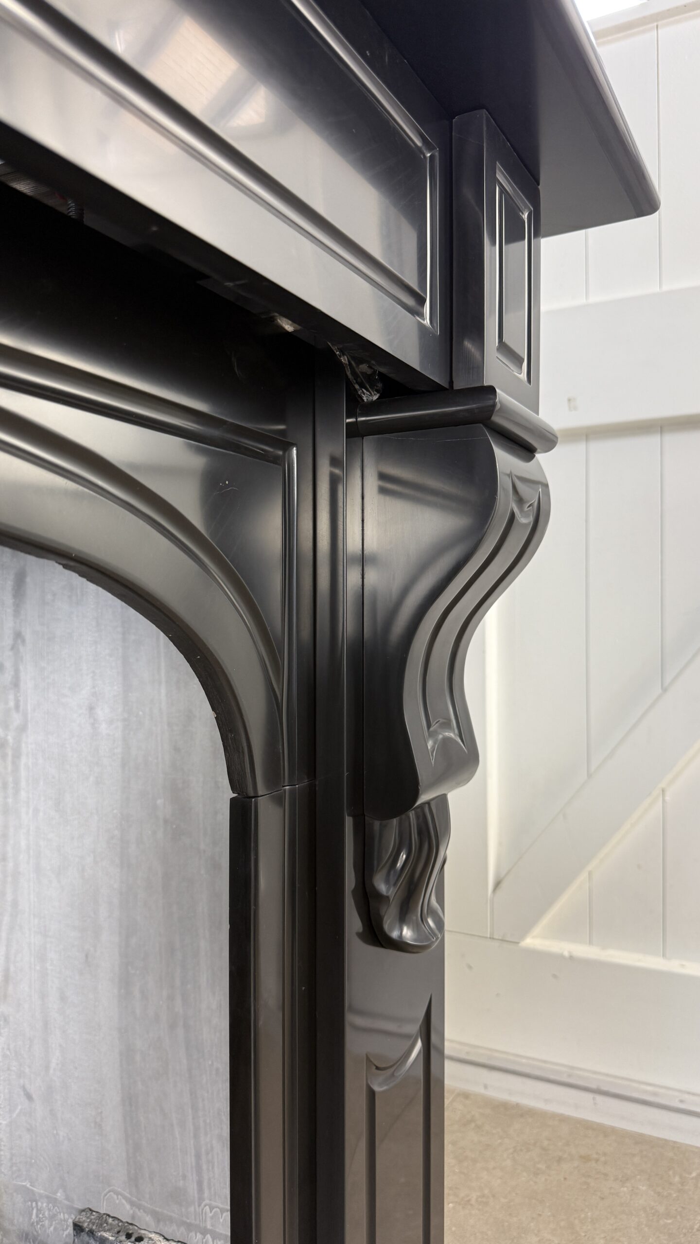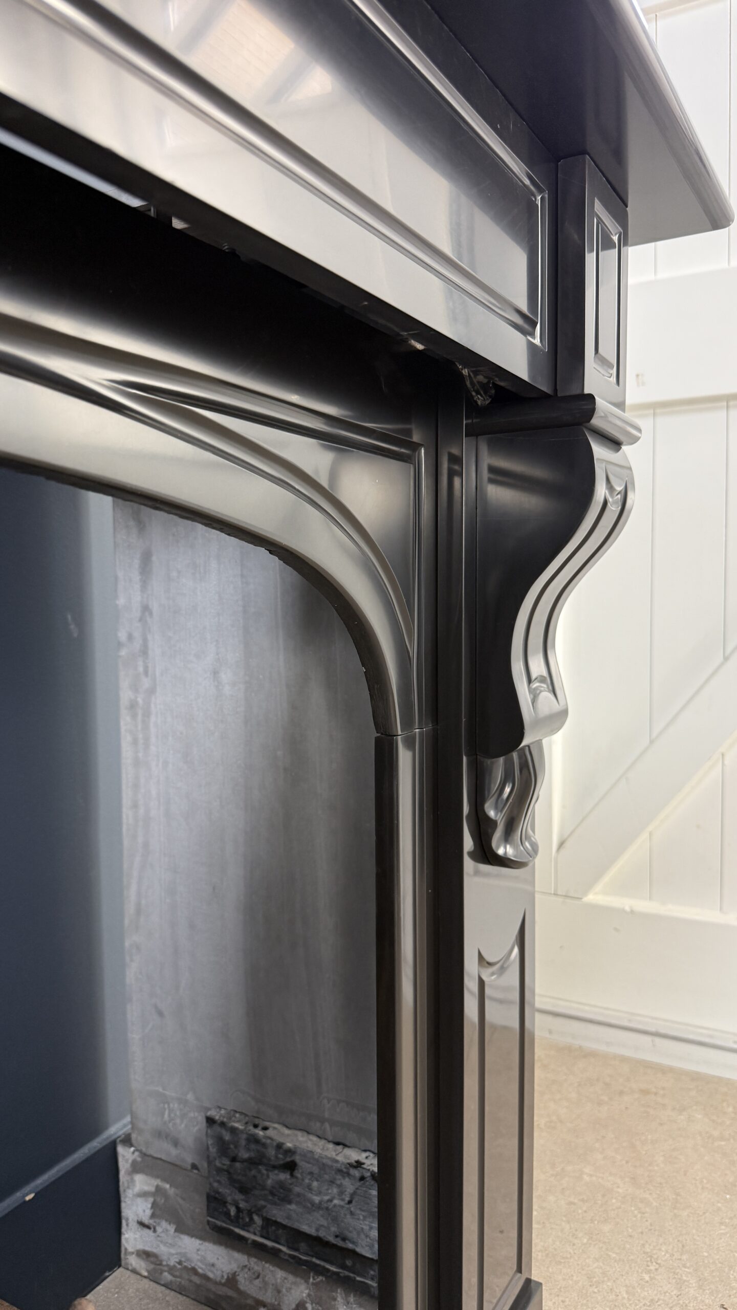 Antieke omloop schouw vervaardigd uit Noir de Mazy , een diepzwart Belgisch marmer dat bekendstaat om zijn egale kleur en zachte glans. Het ontwerp wordt gekenmerkt door een ronde toog, die de opening sierlijk omlijst en het geheel een vloeiende vorm geeft. In het front bevindt zich een rond medaillon, een subtiel klassiek detail dat het strakke lijnenspel doorbreekt.