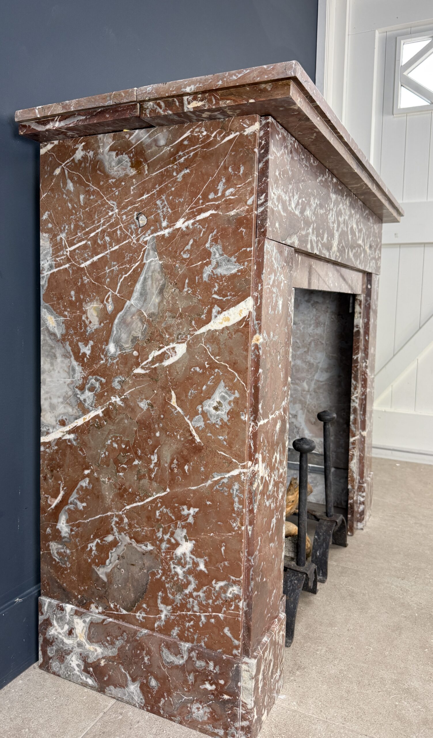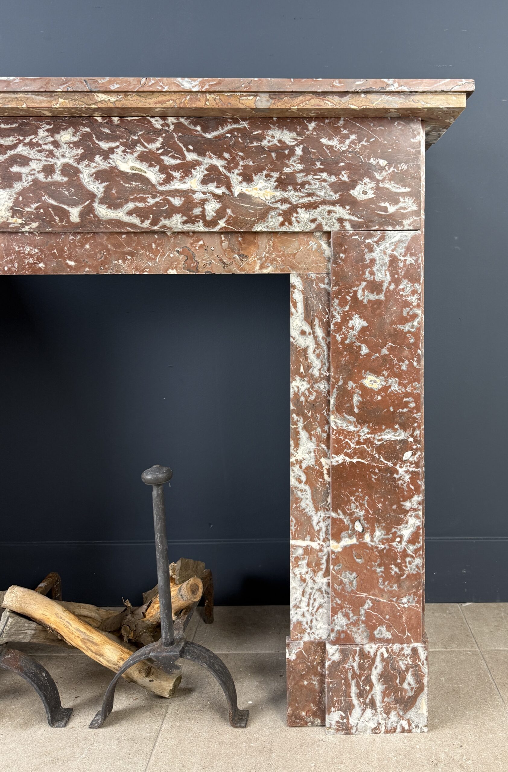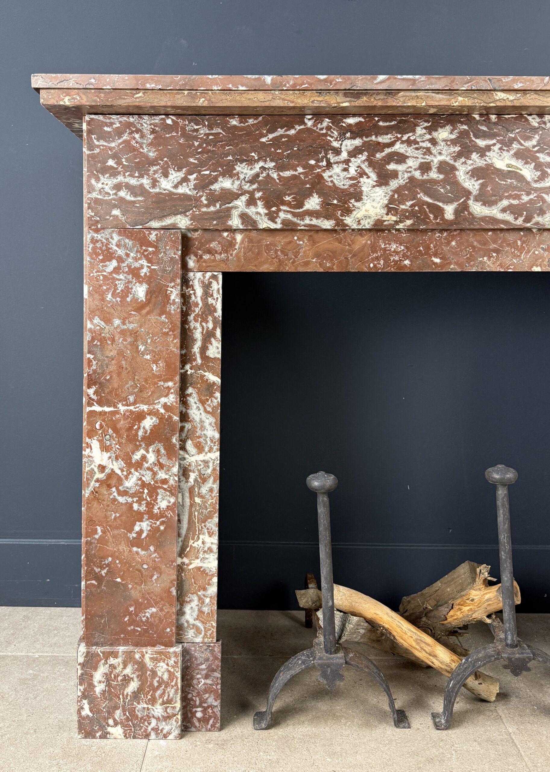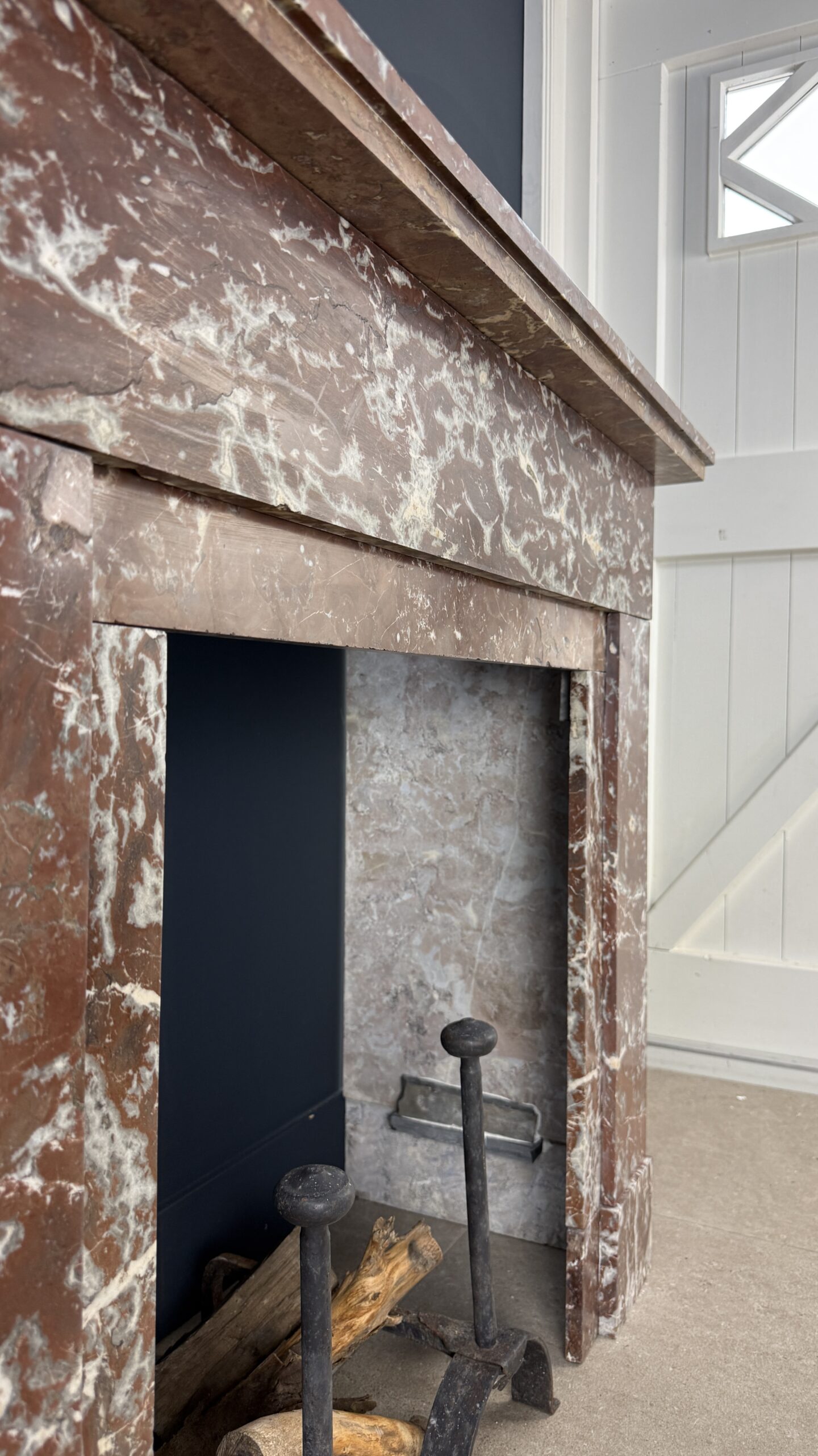 Antieke omloopschouw in Art Deco stijl uitgevoerd in rood marmer met wit/grijze adering. Het strakke art deco ontwerp van deze schouw wordt gedecoreerd door de weelderige wit/grijze adering van het marmer soort.
